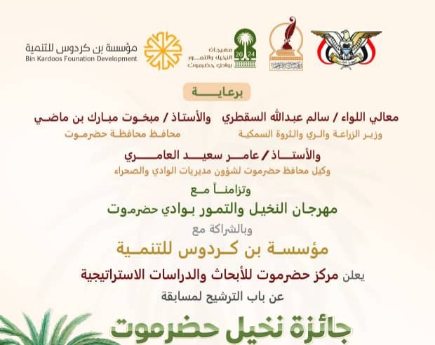أعلن مركز حضرموت للأبحاث والدراسات الاستراتيجية، عن إطلاق جائزة نخيل حضرموت ، تزامنا مع مهرجان النخيل والتمور بوادي حضرموت .