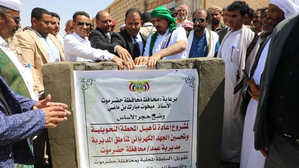 حيث وضع محافظ حضرموت حجر الأساس لمشروع إعادة تأهيل المحطة التحويلية وتحسين الجهد الكهربائي لمناطق مديرية عمد بتمويل من السلطة المحلية بالمحافظة.