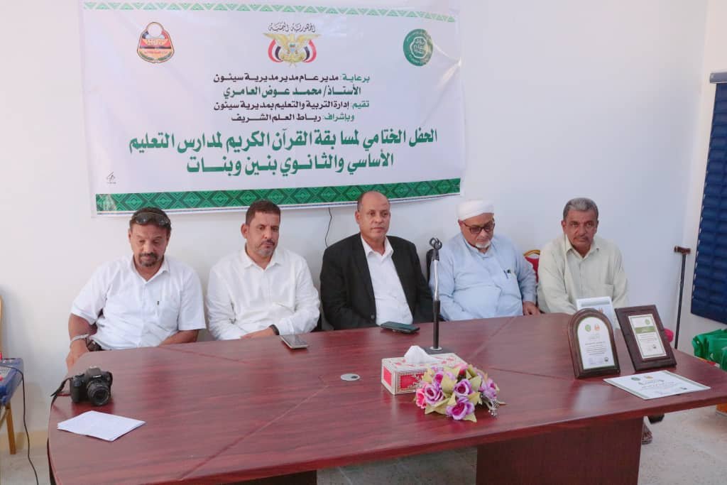 وفي الحفل بارك مدير عام مديرية سيئون محمد عوض العامري نجاح المسابقة القرآنية بنسختها الثامنة والتي حظيت بمشاركة واسعة من مدراس التعليم الأساسي والثانوي بنين وبنات بالمديرية، معربا عن تطلعاته في النهوض بالمستوى التربوي العلمي والشرعي لطلاب وطالبات المديرية وأهمية بعث رسالة سلام بتعاليم الدين الإسلامي الذي يقوم على التسامح والسلام والاعتدال.