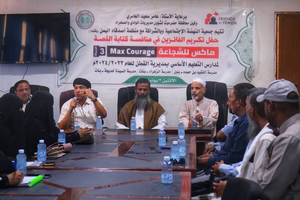 (ماكس للشجاعة) لطلاب مدارس التعليم الأساسي بالمديرية للعام الدراسي 2024/2023م بتمويل من منظمة أصدقاء اليمن بكنداء وتنفذها جمعية النهضة الإجتماعية بالشراكة مع إدارات التربية والتعليم بمديريات وادي حضرموت.