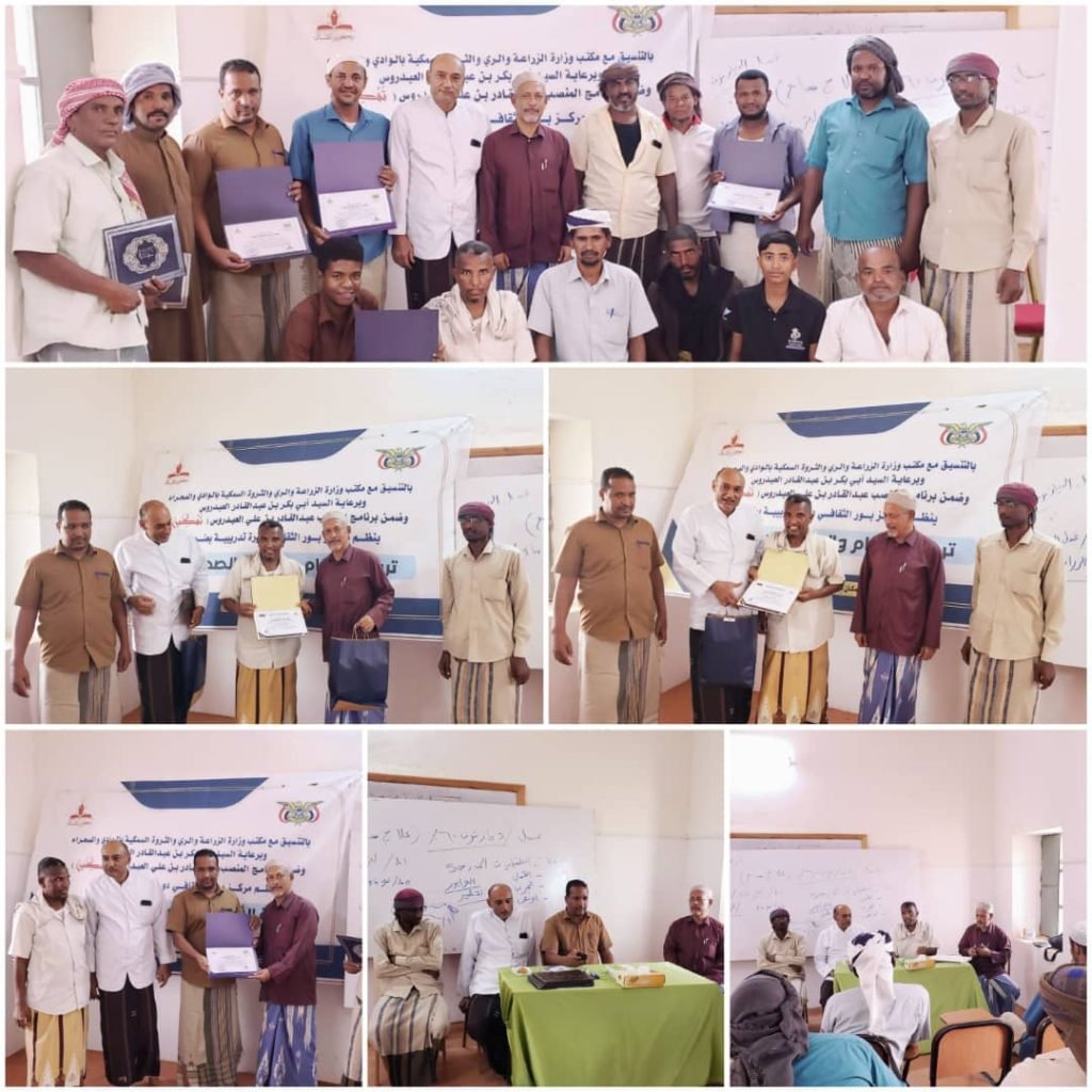 وجرى في ختام الدورة التدريبة التي حضرها الدكتور/حسن أنيس الكاف مدير الإنتاج الحيواني بمكتب وزارة الزراعة والري بوادي حضرموت والدكتور صالح مهدي الحداد مدير الصحة الحيوانية والحجر البيطري تكريم مدربي الدورة و ( ٢٠) مشاركا متدرباً من ملاك ومربي الأغنام بمنطقة بور والذين تلقوا على مدى ٦ أيام متواصلة مجموعة متنوعة من الخبرات المعرفية والمهارات التطويرية التي تهم المختصين بتربية الأغنام بهدف زيادة الإنتاج الحيواني وتحسين المعيشة.