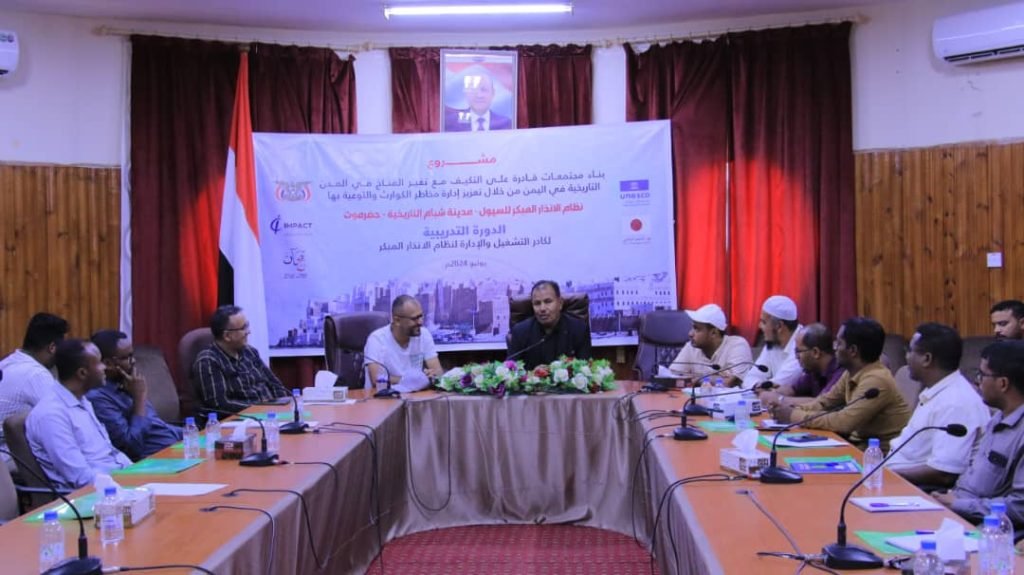 بدأت اليوم في مدينة سيئون دورة تدريبية للكادر الخاص بتشغيل وإدارة نظام الانذار المبكر، وذلك ضمن مشروع بناء مجتمعات قادرة على التكيف مع متغيرات المناخ في المدن التاريخية في اليمن من خلال تعزيز إدارة المخاطر الكوارث والتوعية بها الخاص بمدينة شبام التاريخية.