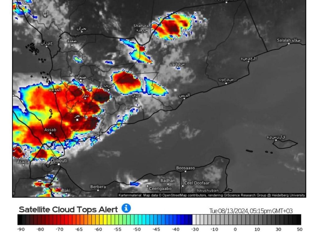 أجزاء من وادي وهضاب حضرموت الداخلية والصحارى تمتد لتشمل الهضبة الجنوبية والغربية ومرتفعات ساحل حضرموت والأرياف المجاورة لها مع تاثير على بعض المناطق الساحلية، حيث ستتأثر بهطول أمطار متفاوتة بين المتوسطة إلى الغزيرة مع تدفق السيول المحلية على بعض الأودية وفروعها.