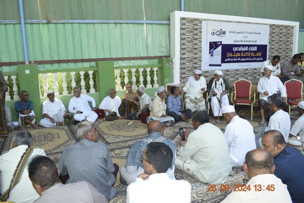 نظمت إلإدارة العامة بإذاعة سيئون يوم أمس لقاءً فرائحياً لمنتسبيها بمناسبة إحتفالها بذكرى تأسيس الإذاعة الحادي والخمسين واشهار كتابها الذي حمل عنوان ( إذاعة سيئون 50 عاما مع الناس ) الذي تم تجميع مواده وطباعته في ذكرى اليوبيل الذهبي لتأسيس الإذاعة.