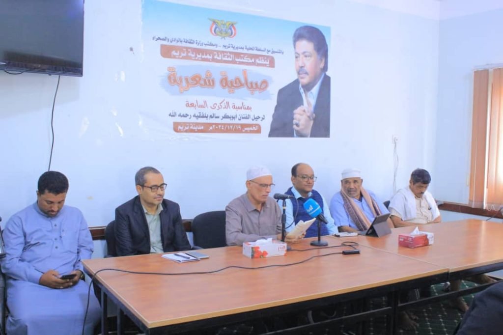 شهدت مديرية تريم يوم أمس ، صباحية شعرية ، بمناسبة الذكرى السابعة لرحيل الفنان أبوبكر سالم بلفقيه ، نظمتها ادارة الثقافة ، بالتنسيق مع السلطة المحلية بمديرية تريم ومكتب وزارة الثقافة بوادي حضرموت والصحراء.