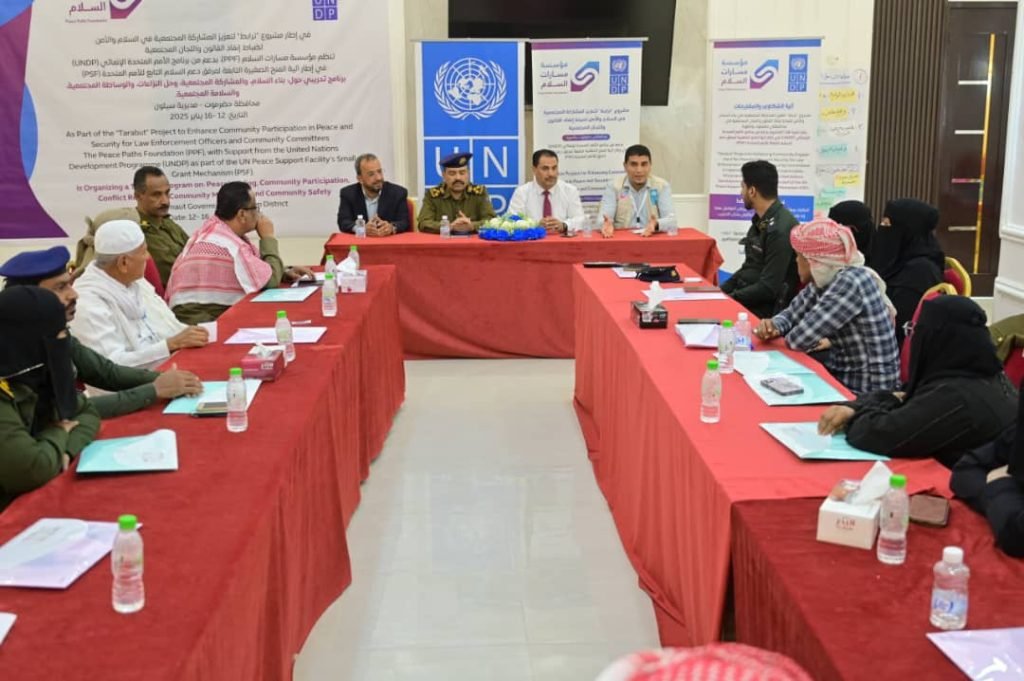اختتمت بمدينة سيئون ورشة تدريبية حول بناء السلام والمشاركة المجتمعية ، نظمتها مؤسسة مسارات السلام بدعم من برنامج الأمم المتحدة الإنمائي UNDP ضمن برنامج ” ترابط ” لتعزيز المشاركة المجتمعية في السلام والأمن لضباط إنفاذ القانون واللجان المجتمعية.