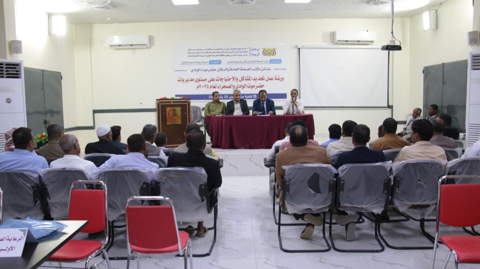 عدد من ممثلي الجهات الصحية والحكومية المختلفة من كافة مديريات وادي وصحراء حضرموت لمناقشة تحديد الإحتياجات والأولويات في عدد من المحاور في الرعاية الصحية الاولية اهمها العلاقة بالمجمتع والبنية التحتية والتقييم وتطوير الكادر .