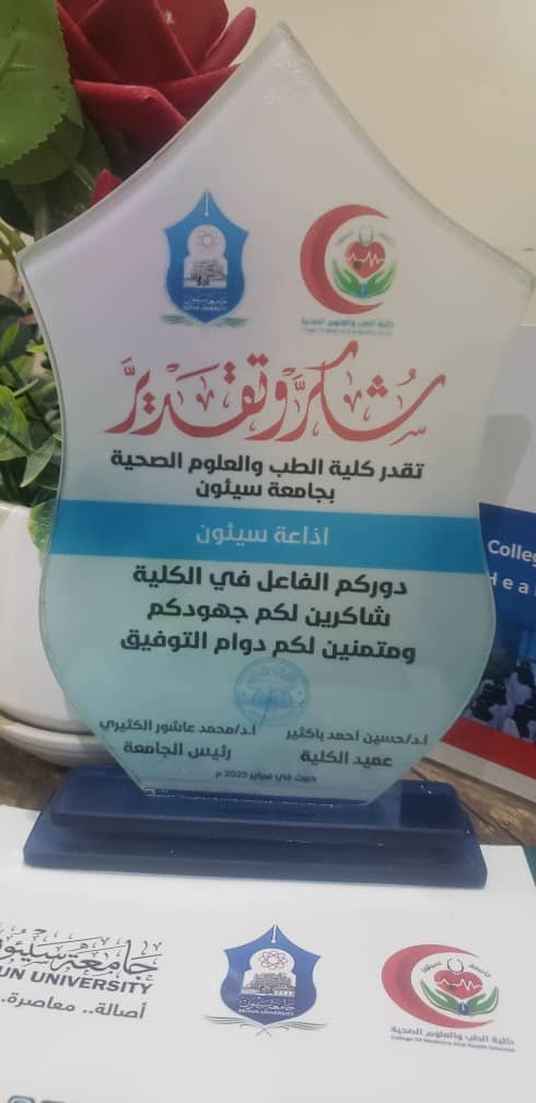 شهدت الفعالية تكريم عدد من الجهات الداعمة والمساهمة في إنجاح تأسيس الكلية، حيث تم *تكريم إذاعة سيئون* بدرع المساهمين تقديرًا لدورها البارز في دعم العملية التعليمية والإعلامية منذ انطلاقة الكلية.