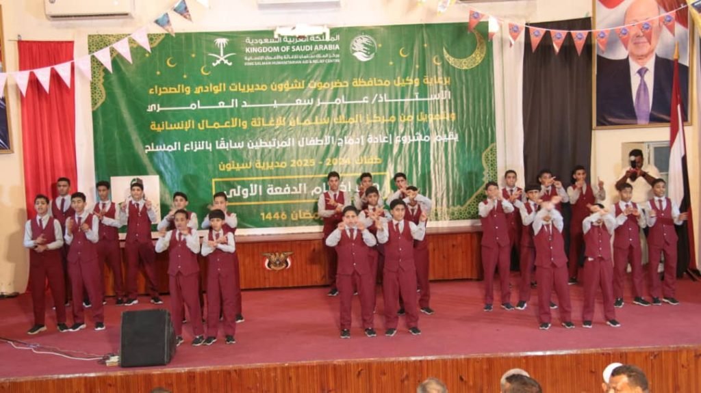 أقيم أمس بمدينة سيئون حفل اختتام الدفعة الأولى من مشروع إعادة إدماج الأطفال المرتبطين سابقًا بالنزاع المسلح، الممول من مركز الملك سلمان للإغاثة والأعمال الإنسانية.