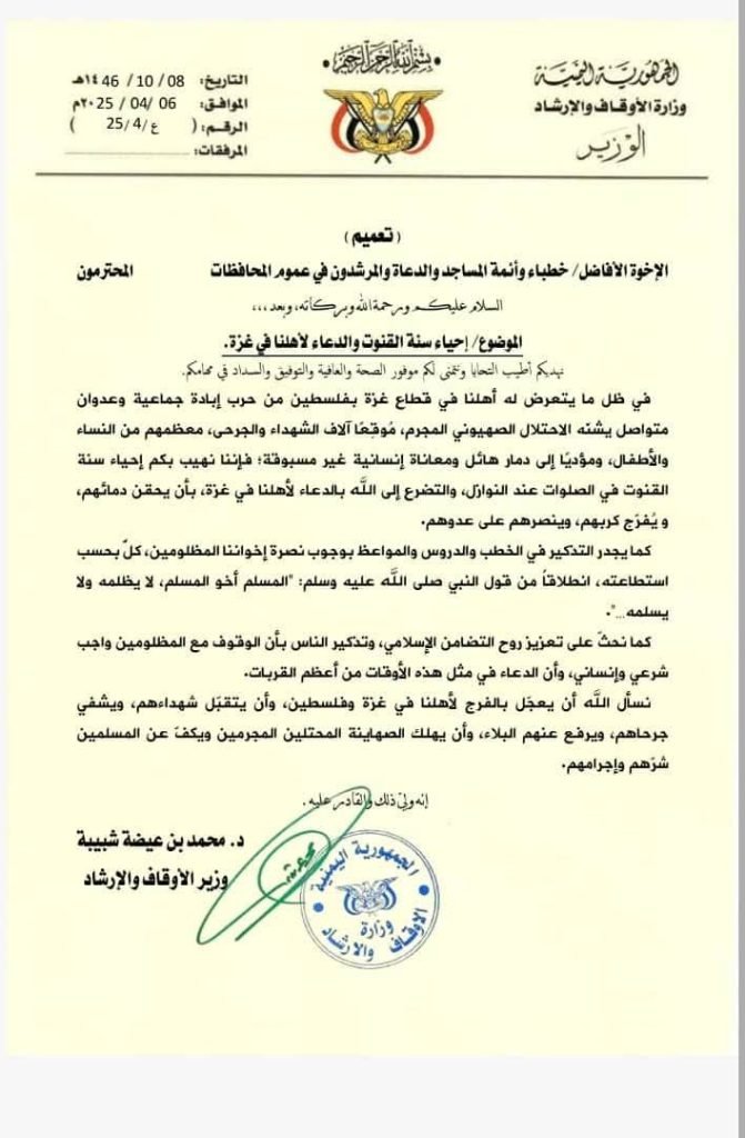 وجاء في التعميم الصادر عن مكتب معالي وزير الأوقاف والإرشاد الدكتور محمد بن عيضة شبيبة، أن الوزارة “تهيب بجميع الأئمة والخطباء أن يتضرعوا إلى الله عز وجل بالدعاء والقنوت نصرةً لإخواننا في غزة، وأن يذكّروا في خطبهم ودروسهم ومواعظهم بواجب نصرة المظلوم، انطلاقًا من قول النبي صلى الله عليه وسلم: (المسلم أخو المسلم لا يظلمه ولا يسلمه).”