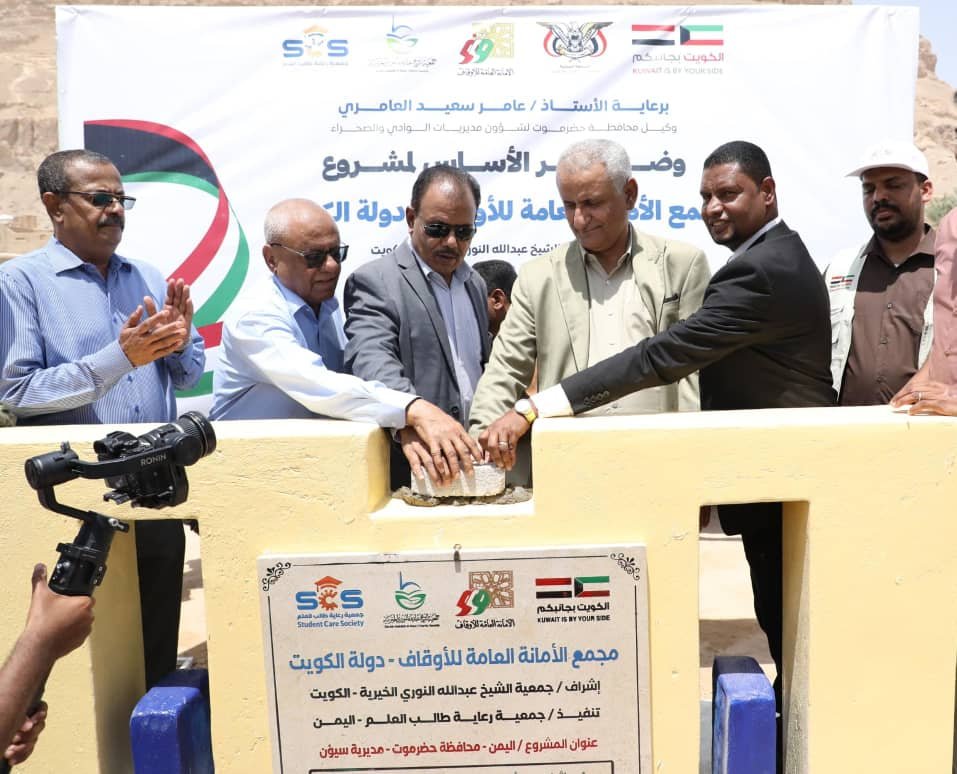 وضع وكيل محافظة حضرموت لشؤون مديريات الوادي والصحراء عامر سعيد العامري، اليوم، حجر الأساس لمشروع مجمع الأمانة العامة للأوقاف الكويتية، الذي تنفذه جمعية رعاية طالب العلم، باشراف جمعية الشيخ عبدالله النوري الخيرية بدولة الكويت .