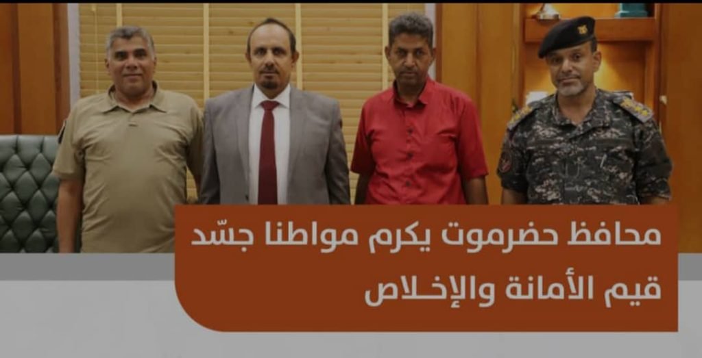 وفي إطار تشجيع قيم النزاهة وتعزيز ثقافة الأمانة، كرّم محافظ حضرموت الأستاذ مبخوت مبارك بن ماضي، ومدير عام الأمن والشرطة بساحل العميد مطيع المنهالي بالمكلا، المواطن أحمد سعيد بخضر (سائق الحافلة الذي عثر على المبلغ وذلك تقديراً لتصرّفه النبيل بتسليم المبلغ المالي الكبير الذي عَثَر عليه داخل مركبته إلى صاحبة الحق،