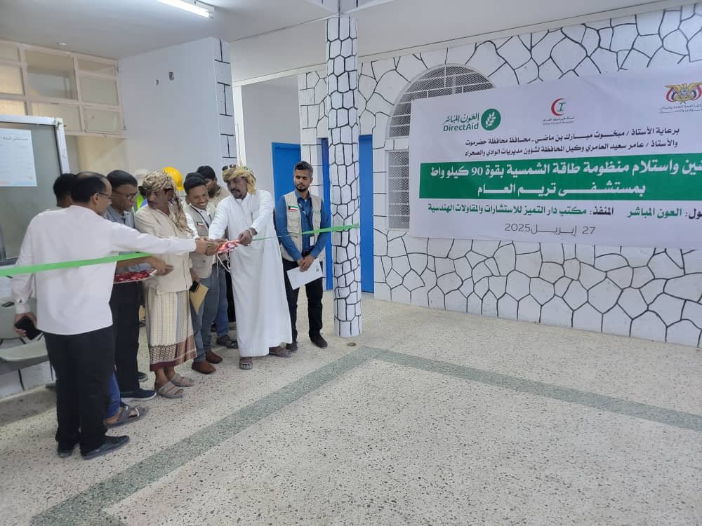 وثمّن مدير عام تريم الجهود الكبيرة التي تبذلها منظمة العون المباشر في دعم القطاع الصحي بالمديرية، مؤكدًا أن المنظومة ستُسهم بشكل كبير في تحسين خدمات المستشفى وضمان استمرارية تشغيل الأجهزة الطبية الحيوية، خاصة في ظل تحديات الكهرباء التي تعاني منها المنطقة.
