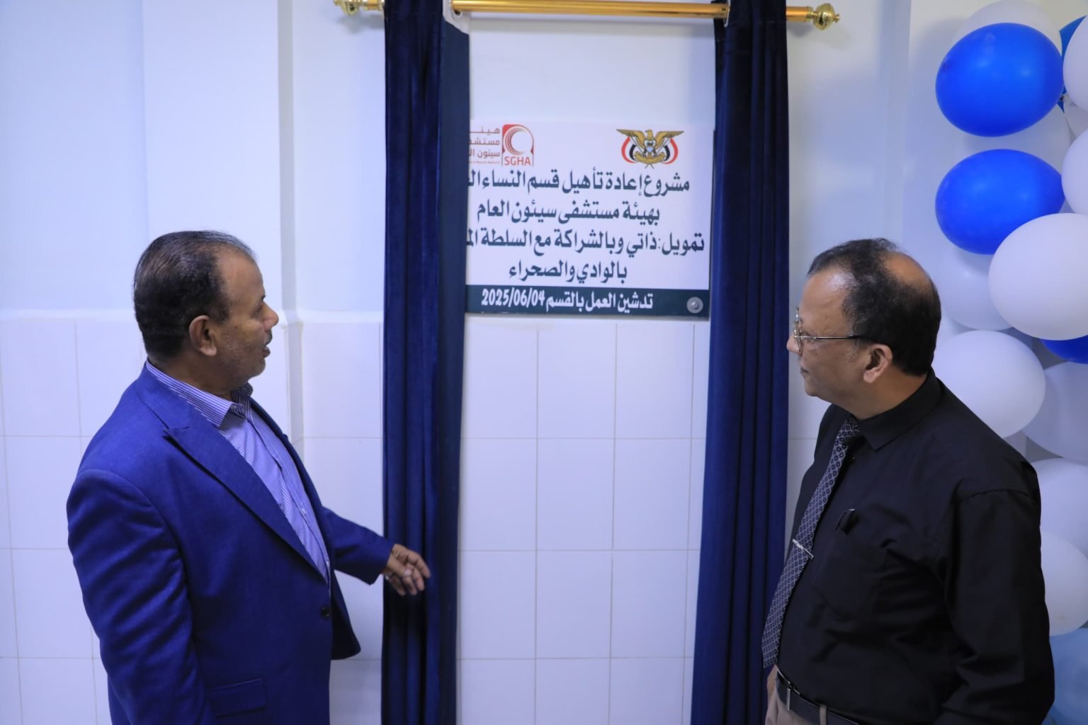 تم صباح اليوم إفتتاح قسم النساء العام بهيئة مستشفى سيئون العام،بعد إعادة تأهيله وذلك بتمويل ذاتي وبالتعاون مع السلطة المحلية بوادي حضرموت والصحراء .
