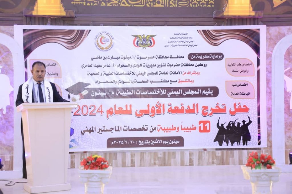 نظم المجلس اليمني للاختصاصات الطبية بسيئون، اليوم ، وبالتنسيق مع مكتب وزارة الصحة العامة والسكان بوادي وصحراء حضرموت ، حفل تخرج الدفعة الأولى للعام 2024م من الأطباء في برنامج الماجستير المهني (11) طبيبًا وطبيبة من تخصصي طب التوليد وأمراض النساء ، وطب الباطنة العامة.