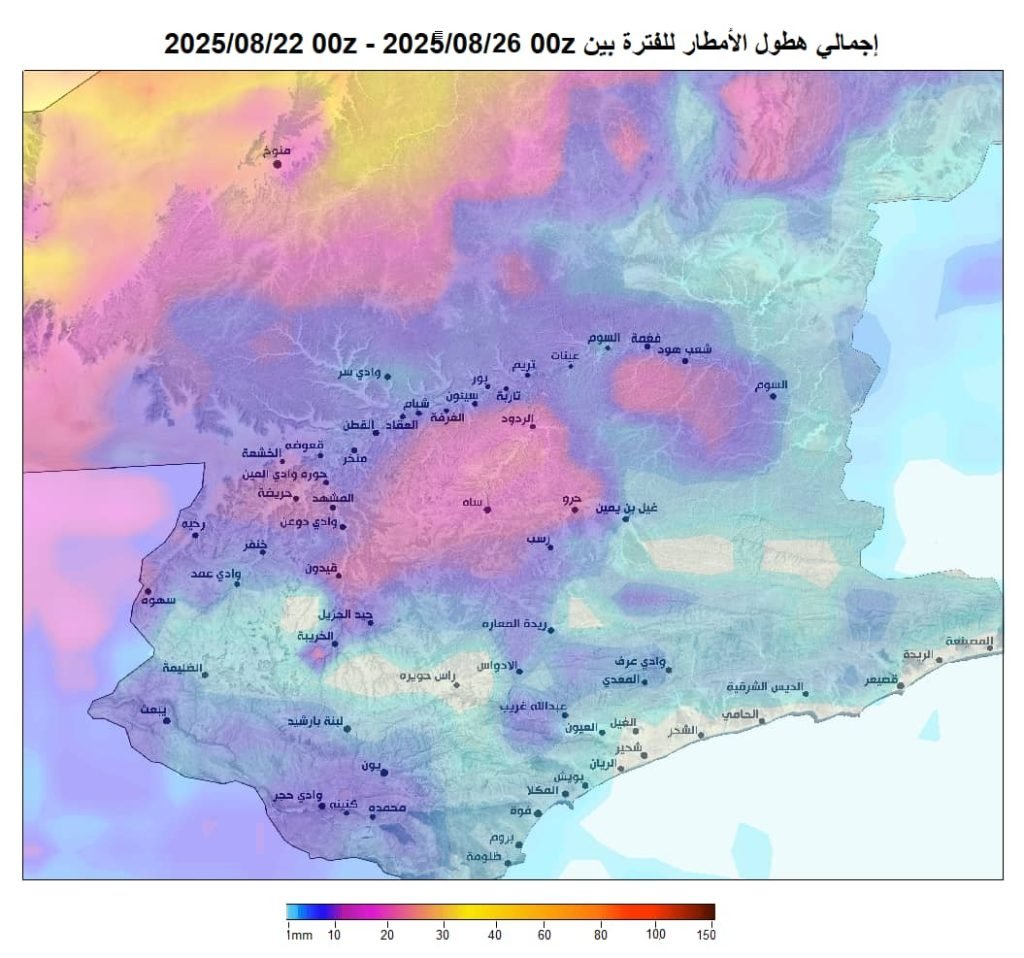 أجزاء من صحاري ووادي وهضاب حضرموت الداخلية أمتداداً للمرتفعات الجبلية الساحلية والأرياف المحيطة ، ستتأثر بهطول أمطار متفاوتة تتراوح بين الخفيفة والمتوسطة إلى الغزيرة أحياناً مع أحتمالية تدفق السيول في الشعاب والأودية وفروعها .