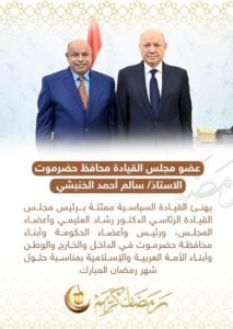 رفع عضو مجلس القيادة الرئاسي محافظ حضرموت سالم أحمد الخنبشي، أسمى آيات التهاني والتبريكات إلى القيادة السياسية ممثلة بفخامة الرئيس الدكتور رشاد محمد العليمي رئيس مجلس القيادة الرئاسي، وأعضاء المجلس، ودولة رئيس الوزراء وأعضاء الحكومة، وإلى أبناء الشعب اليمني عامة وأبناء محافظة حضرموت خاصة، وذلك بمناسبة حلول شهر رمضان المبارك.