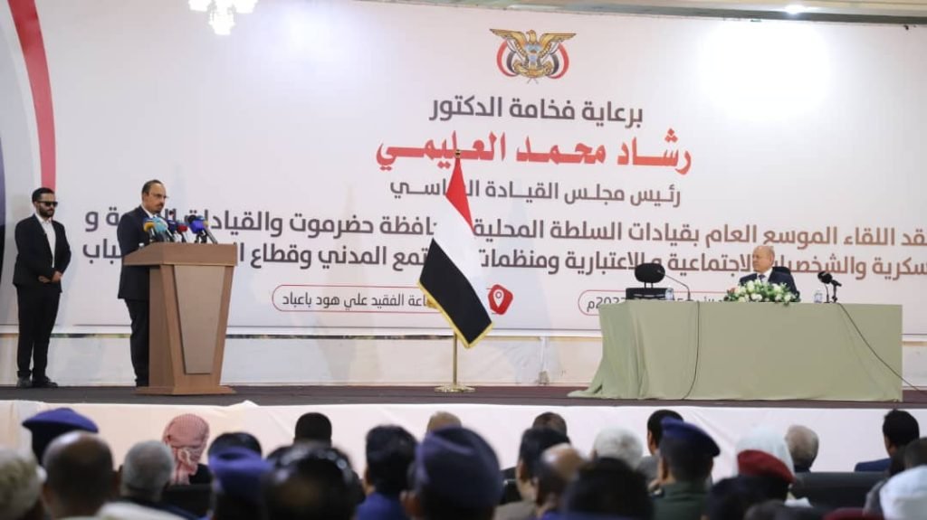 شهد فخامة الرئيس الدكتور رشاد محمد العليمي، رئيس مجلس القيادة الرئاسي، اليوم بمدينة المكلا، ومعه عدد من المستشارين والمسؤولين في الدولة، ومحافظ حضرموت الأستاذ مبخوت مبارك بن ماضي، وقيادات السلطة المحلية بالمحافظة، اللقاء الموسع العام بقيادات السلطة المحلية بحضرموت والقيادات الامنية والعسكرية والشخصيات الاجتماعية والاعتبارية ومنظمات المجتمع المدني وقطاعي المرأة والشباب.