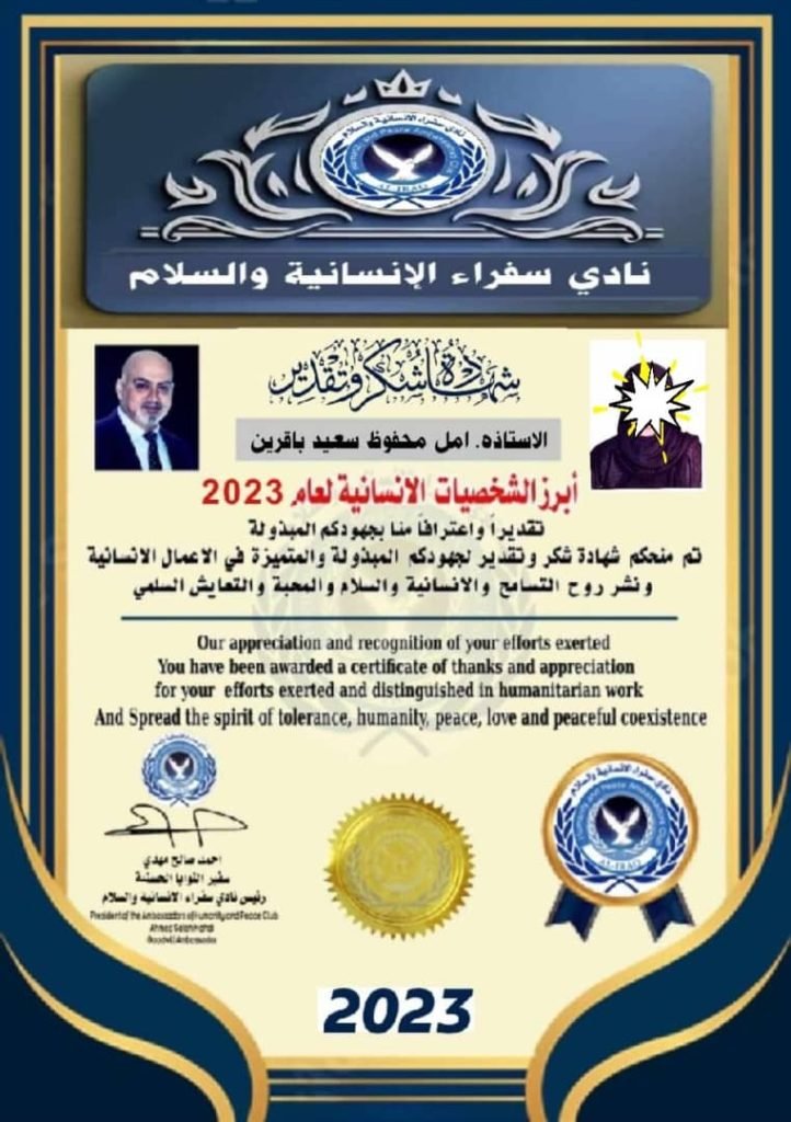 وورد في شهادة الشكر والتقدير التي تمنح لابرز الشخصيات الإنسانية للعام 2023م والموقعة من قبل سفير النوايا الحسنة رئيس نادي سفراء الإنسانية والسلام احمد صالح مهدي ” تقديرا واعترافا منا بجهودكم المبذولة تم منحكم شهادة شكر وتقدير لجهودكم المبذولة والمتميزة في الاعمال الانسانية ونشر روح التسامح والانسانية والسلام والمحبة والتعايش السلمي”.