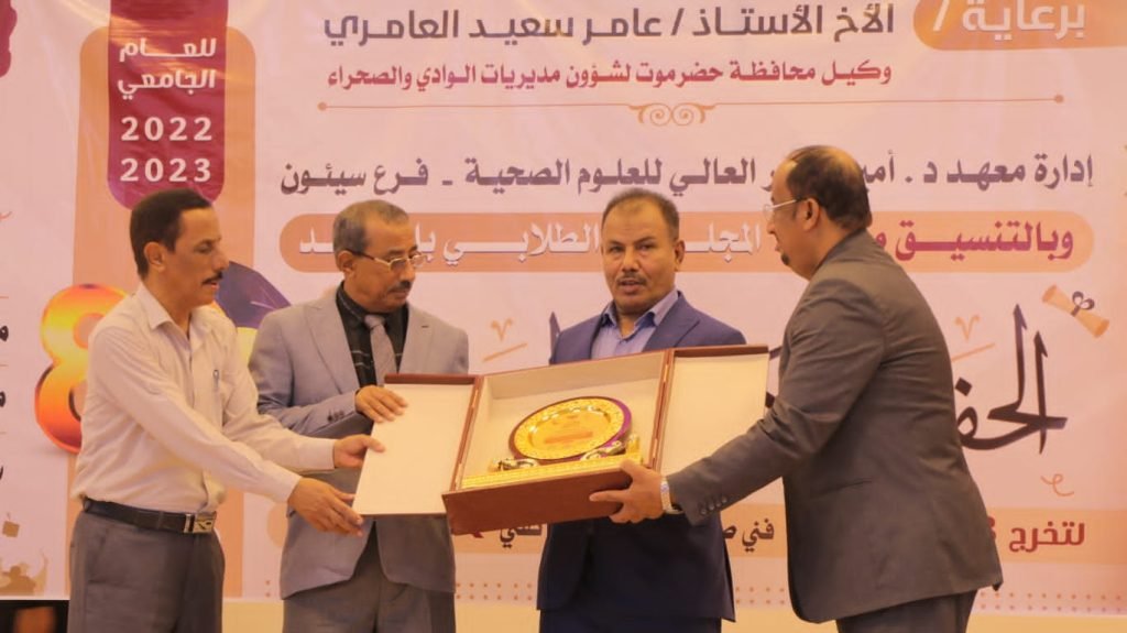 شهد وكيل محافظة حضرموت لشؤون مديريات الوادي والصحراء الاستاذ عامر سعيد العامري صباح اليوم الحفل التكريمي والتوديعي ل80 طالب وطالبة من أقسام فني صيدلة، تمريض تقني، فني علاج طبيعي بمعهد امين ناشر العالي للعلوم الصحية فرع سيئون.