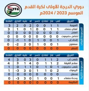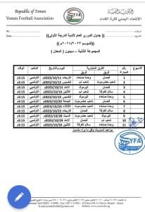 أصدر الإتحاد اليمني لكرة القدم اليوم نتائج الجولة الثانية من الدوري اليمني لكرة القدم الدرجة الأولى، وكذا جدول يبين ترتيب مجموعتا الدوري، و جدول المباريات المعدل للمجموعة الثانية ( سيئون )، وهي كالآتي: