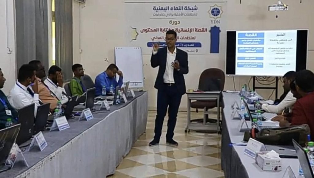 نظم مكتب شبكة النماء اليمنية للمنظمات الأهلية بوادي حضرموت اليوم بسيئون دورة حول القصة الانسانية وكتابة المحتوى لمنظمات المجتمع المدني .