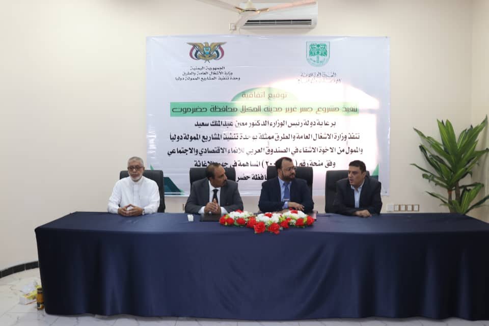 جرى يوم أمس الاثنين بالعاصمة المؤقتة عدن ، التوقيع على اتفاقية تنفيذ مشروع جسر “غرير” بمدينة المكلا المموّل من الصندوق العربي للتنمية الاقتصادية والاجتماعية وفق منحة المساهمة في جهود الإغاثة وإعادة الإعمار بمحافظة حضرموت رقم (49 -2008).