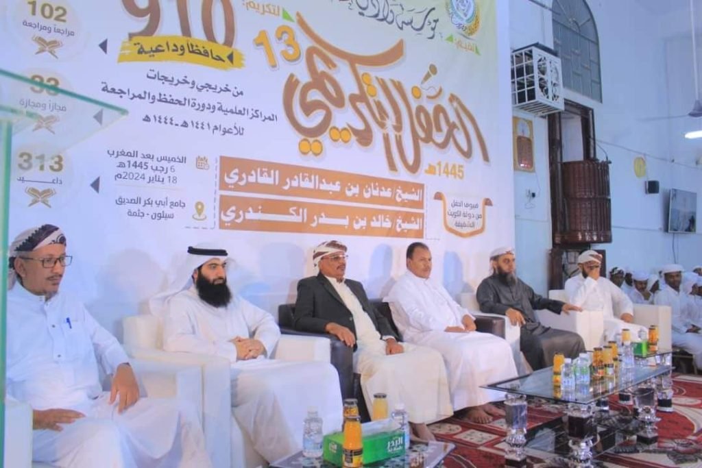 كرمت مؤسسة وادي حضرموت الخيرية مساء امس 910 من خريجي وخريجات من المجازين والمجازات بالمراكز العلمية ودورة الحفظ والمراجعة للأعوام 1441هـ – 1444هـ برعاية السلطة المحلية وتمويل الجمعية الكويتية للعمل الإنساني .