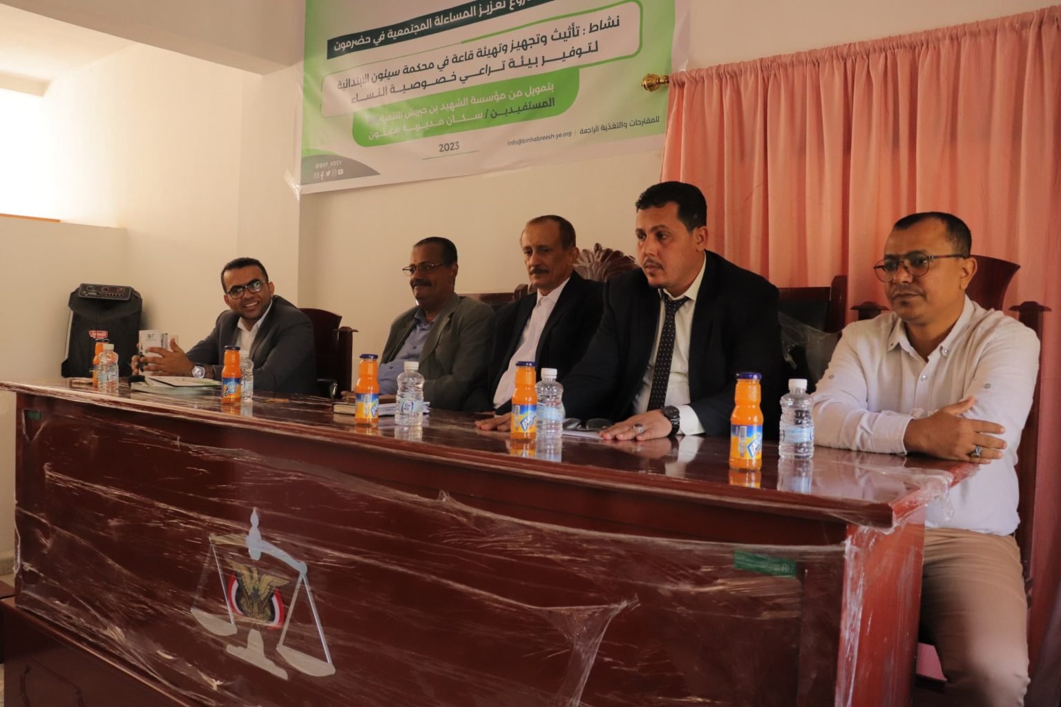 ضمن انشطة مشروع تعزيز المسائله المجتمعية بمحافظه حضرموت وبتمويل من مؤسسة بن حبريش للتنمية افتتح القاضي علي عبده هائل رئيس شعبة إستئناف سيئون بمعية فضيلة القاضي سامي صلاح الكثيري رئيس شعبة محكمة سيئون الابتدائية بمدينة سيئون يوم امس قاعة في محكمة سيئون بعد تأثيثها وتجهيزها وتهيئتها بهدف توفير بيئة تراعي خصوصية النساء .