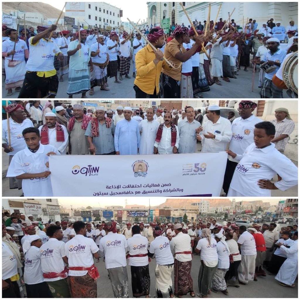 على دقات الطبول وترديد أبيات من الشعر الشعبي التي تتغنى بذكرى تأسيس الإذاعة الخمسين أحيت حافة سحيل سيئون عصر اليوم الجمعة في إطار الشراكة مع إذاعة سيئون وضمن فعاليات إحتفالاتها بذكرى تأسيسها الخمسين ألعاب شعبية ترويحة لعدة لعبة الشبواني بمشاركة هواة لعبة رقصة الشبواني بحافة السحيل الذين تزينوا بشعار إذاعة سيئون وذكرى تأسيسها الخمسين و تغنوا بقصائد وأبيات شعرية عبرت عن الإعتزاز والفخر بالرسالة الإعلامية التي تقوم بها إذاعة سيئون منذ تأسيسها وحتى اليوم ورددوا الكلمات الموزونة فرحا وإبتهاجا باليوبيل الذهبي للإذاعة وبلوغها خمسين عاما من العطاء والإبداع وإرتباطها وقربها بقضايا الناس والمجتمع .