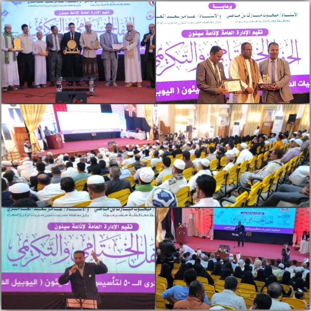 توجت إذاعة سيئون صباح اليوم فعاليات إحتفالاتها بذكرى تأسيسها الخمسين ويوبيلها الذهبي بإقامة حفل ختامي وتكريمي لروادها وكادرها الإذاعي العامل منذ مرحلة التأسيس وحتى اليوم .