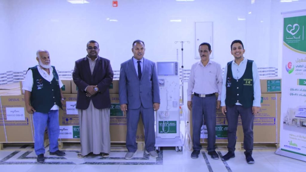 تسلم مركز فاطمة بابطين الطبي لرعاية مرضى الفشل الكلوي بسيئون، اليوم، خمسة أجهزة وخمسة كراسي استصفاء دموي، مقدمة من مركز الملك سلمان للاغاثة والأعمال الانسانية عبر جمعية الامير فهد بن سلمان لرعاية مرضى الفشل الكلوي “كلانا” ، وتنفيذ ميدانيا مؤسسة صلة للتنمية.