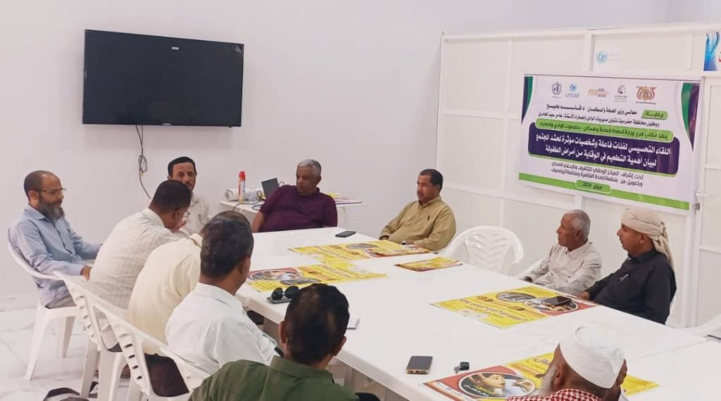 نظم مكتب الصحة والسكان بوادي حضرموت والصحراء ، اليوم ، لقاء موسع بالفئات الفاعلة والشخصيات المؤثرة لحشد المجتمع عن أهمية التطعيم للوقاية من أمراض الطفولة بإشراف المركز الوطني للتثقيف والإعلام الصحي ،