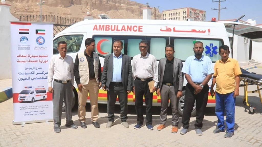 تسلم مكتب الصحة العامة والسكان بوادي حضرموت والصحراء، اليوم ، سيارة اسعاف جديدة مجهزة بكامل المعدات الطبية مقدمة من جمعيو الهلال الأحمر الكويتي دعم من مركز الكويت التخصصي للعيون عبر الشريك المنفذ مؤسسة استجابة للأعمال الانسانية والاغاثية.
